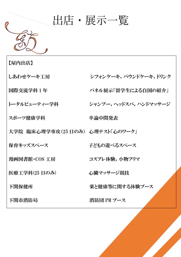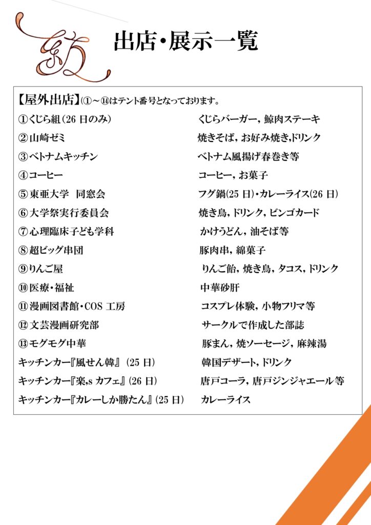 両日とも学生有志による模擬店や各学科の特色を活かした展示やイベントを開催し、初日(25日)には東亜大学同窓会より、来場の皆様に「ふぐ鍋」が無料で振る舞われます(数量限定)。