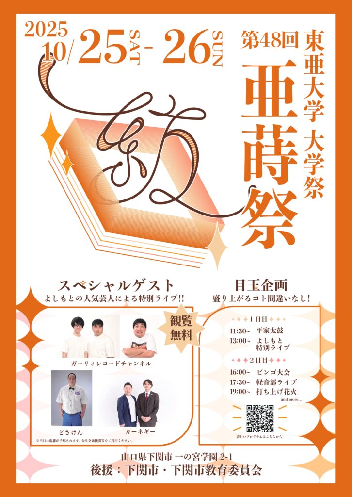 第48回目となる東亜大学祭(亜蒔祭)を、2025年10月25日と26日の両日に開催します。