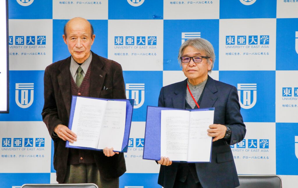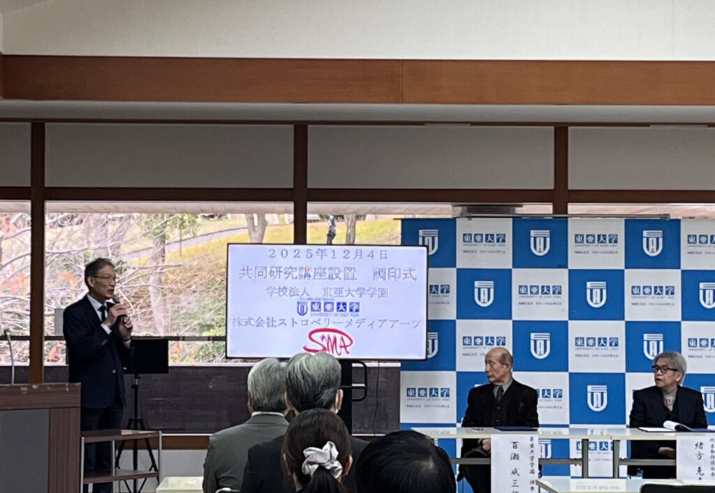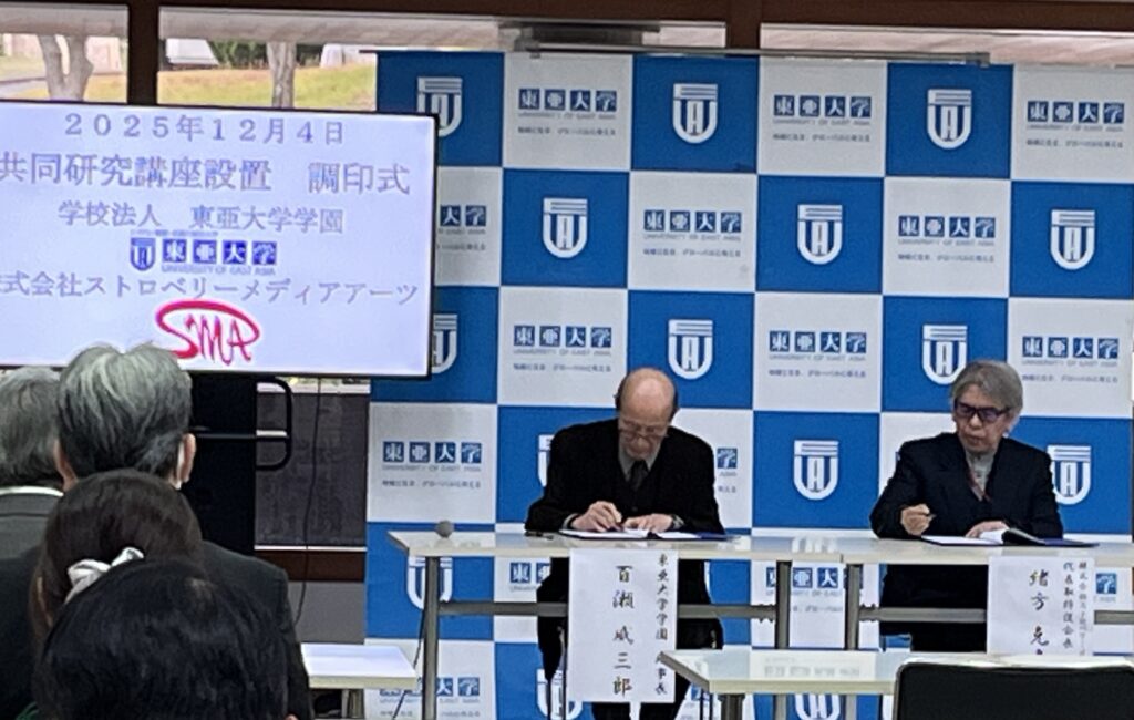 12/4(木)東亜大学は下関市に本社を置く、株式会社ストロベリーメディアアーツと、調印式を執りおこないました。『共同研究講座の設置』をおこない、単なる技術導入に留まらず、映像を「探求のためのレンズ」として活用し、学術的なブレイクスルーを促す新たな産学連携プラットフォームを構築していく予定です。最終的には研究成果を知財化し、これを教育プログラムへ還元することで、東亜大学芸術学部アートデザイン学科および東亜大学大学院総合学術研究科デザイン専攻から、社会に向けた新たな価値の提案を目指します。またさらに、株式会社ストロベリーメディアアーツが業務上開発した最先端の映像メディア技術を東亜大学が展開する教育プログラムにおいて利活用し、国内外の映像メディア産業の発展に資する人材育成に貢献していきます。