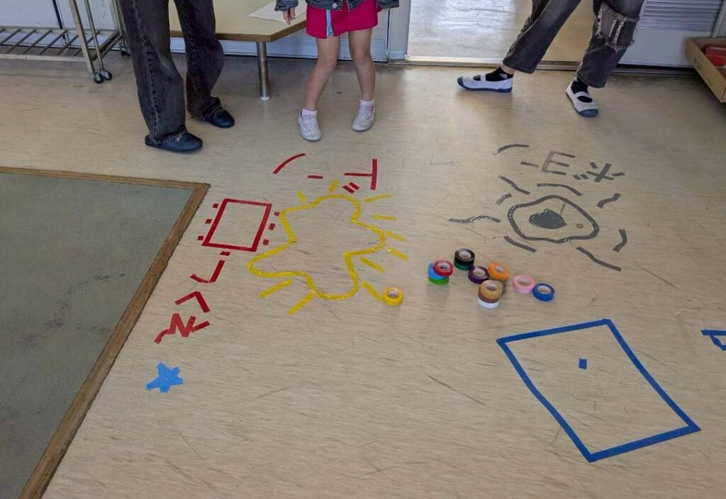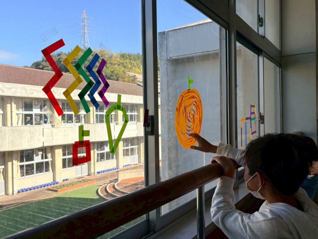 前半の音楽体験では、校内を巡る「音聴き歩き」を行い、階段の足音や調理の音、友だちの声など、身近な環境音に意識的に耳を傾け、その印象を図や絵で表現しました。後半の図画工作では、14色のカラーテープを用いて、校内の窓や壁、床をキャンバスに見立てた空間表現に挑戦し、音から得たイメージを自由でダイナミックなアートとして形にしました。完成後は作品を紹介し合い、感じたことや工夫した点を言葉で共有しました。