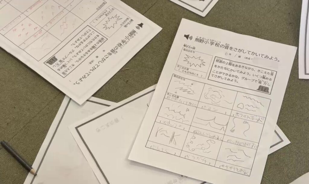 今回は、芸術学部アート・デザイン学科の川野裕一郎教授と、人間科学部心理臨床・子ども学科の金子珠世准教授による協働企画「サウンドエデュケーション:音の道をたどるワークショップ『聴いて・感じて・かたちにする』音の冒険」を開催し、熊野小学校の児童約40名と下関市立川中中学校の生徒が参加しました。本学からは教員志望の学生7名、県内大学生3名、教員4名が運営に携わりました。