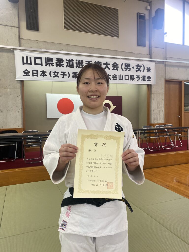 3位入賞いたしました、清原 美桜さんは3月8日に広島県で開催される中国地区柔道選手権大会への出場権を獲得いたしました。